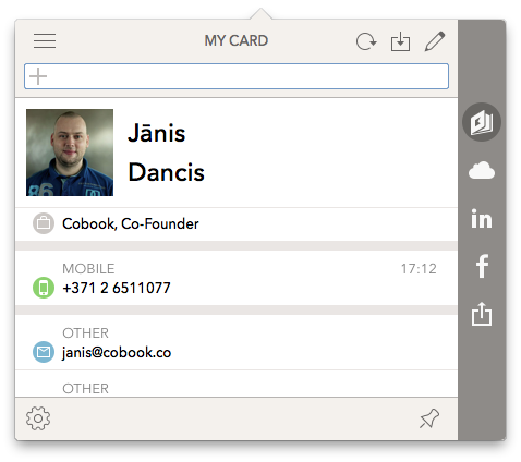 My Card(accessible via ☰ -> My Card or ⌘D) is a special linked contact that is synced to Cobook servers and can be shared using a URL. It can be created and edited using either of these: