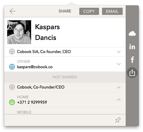 Share screen will display all of the information available for the given contact from all of the linked contacts. It is possible to add or remove information about to be shared by clicking on the respective field.